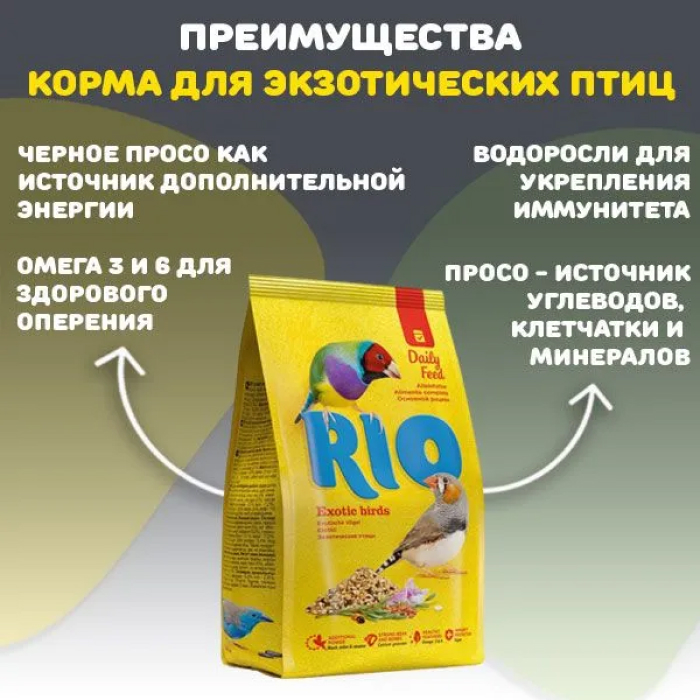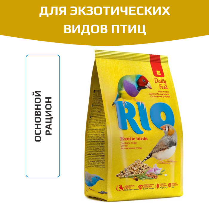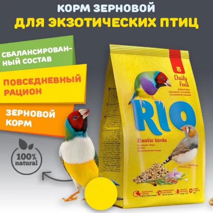 RIO корм для экзотических птиц. Основной рацион - тщательно сбалансированная зерновая смесь, в состав которой отобраны самые полезные и любимые амадинами, астрильдами и другими видами ткачиков зерна и семена. Их разнообразие обеспечит птицу всеми необходимыми питательными веществами.