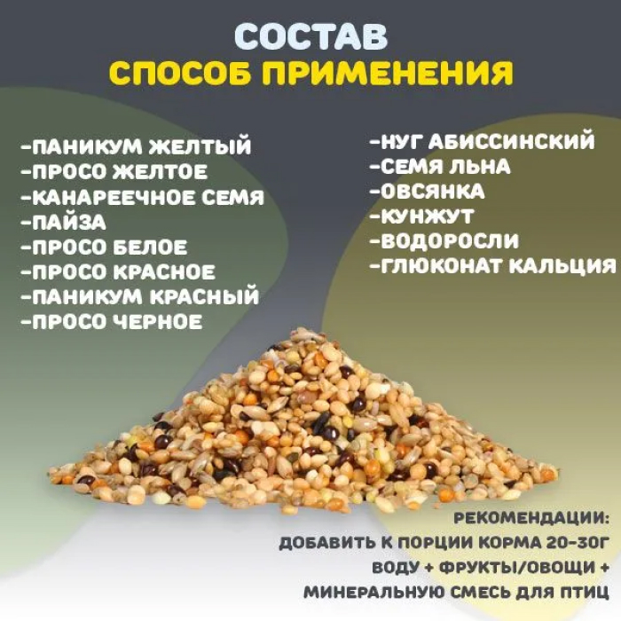 Паникум желтый Просо желтое Канареечнное семя Пайза Просо белое Просо красное Паникум красный Просо черное (4%) Нуг абиссинский Семя льна Овсянка Кунжут Водоросли (0,2%) Глюконат кальция (0,1%).