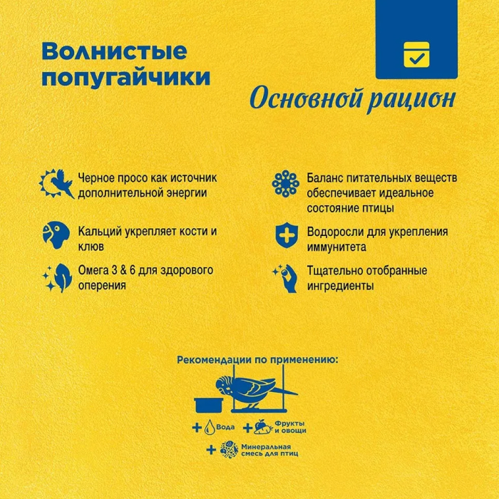 Основной рацион – тщательно сбалансированная зерновая смесь для ежедневного кормления волнистых попугайчиков, в состав которой отобраны самые полезные и любимые попугайчиками зерна и семена. Их разнообразие обеспечит птицу всеми необходимыми питательными веществами. Содержит редкие семена абиссинского нуга и другие любимые попугайчиками зерна и семена.