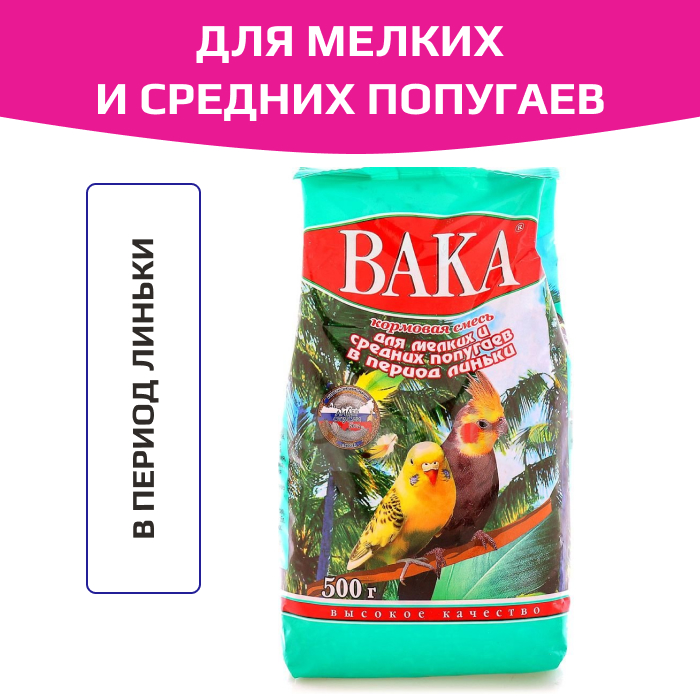 Вака высокое качество корм для мелких и средних попугаев в период линьки.