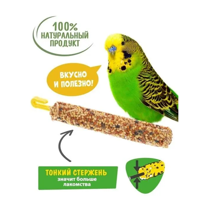 Используйте палочки, как лакомство или вместе с зерновой смесью, не чаще 1 раза в неделю. Извлеките палочку из пакета и закрепите лакомство внутри клетки в подвешенном состоянии. Палочки могут находиться в клетке постоянно, поскольку являются прекрасным дополнением к основному рациону питания птицы.