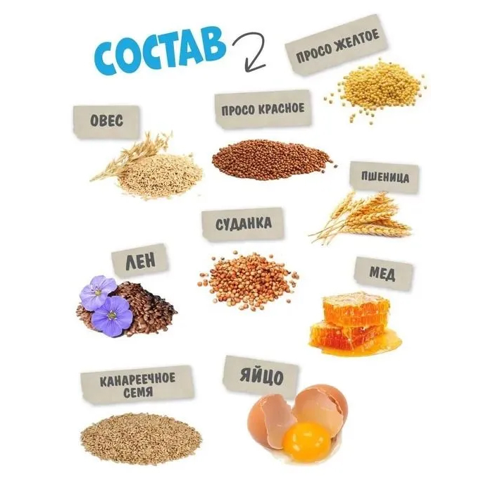 просо жёлтое просо красное суданка пшеница овёс лён канареечное семя мёд яйцо