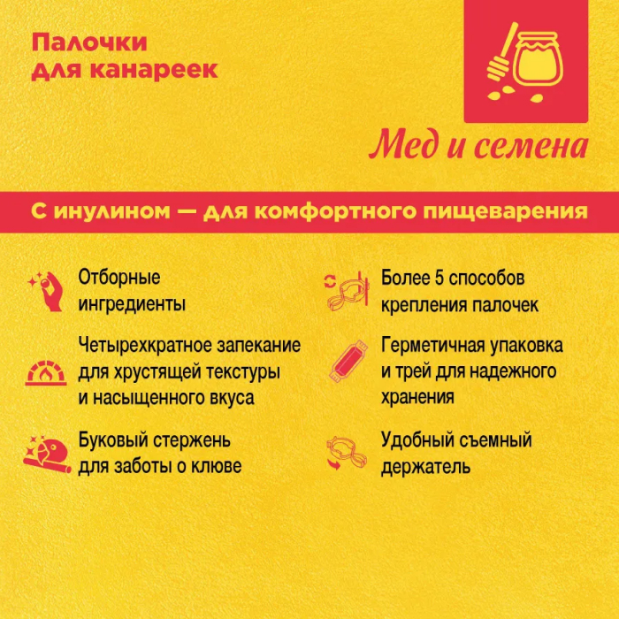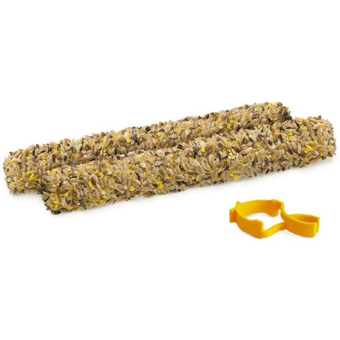 Палочки для канареек с тропическими фруктами содержат отборные ингредиенты и помогают разнообразить рацион питомца. Для хрустящей консистенции палочки выпекаются в печах по технологии бережного запекания, которая сохраняет все полезные свойства продукта. Основа лакомства – буковый стержень, который служит отличным инструментом для стачивания клюва. Палочки могут занять питомца на долгое время, а также станут удобным инструментом для игр и дрессировки. В упаковке имеется съёмный̆ держатель оригинальной̆ формы, который позволит удобно закрепить палочку с учетом размера птица и клетки. Использовать съемный держатель можно и в дальнейшем, закрепляя с его помощью фрукты, овощи и другие продукты.
