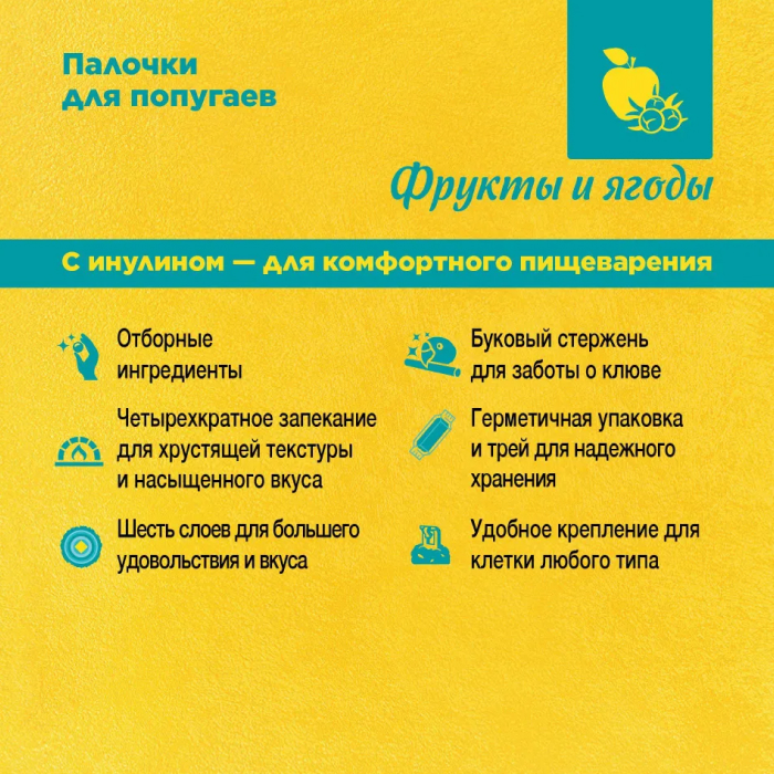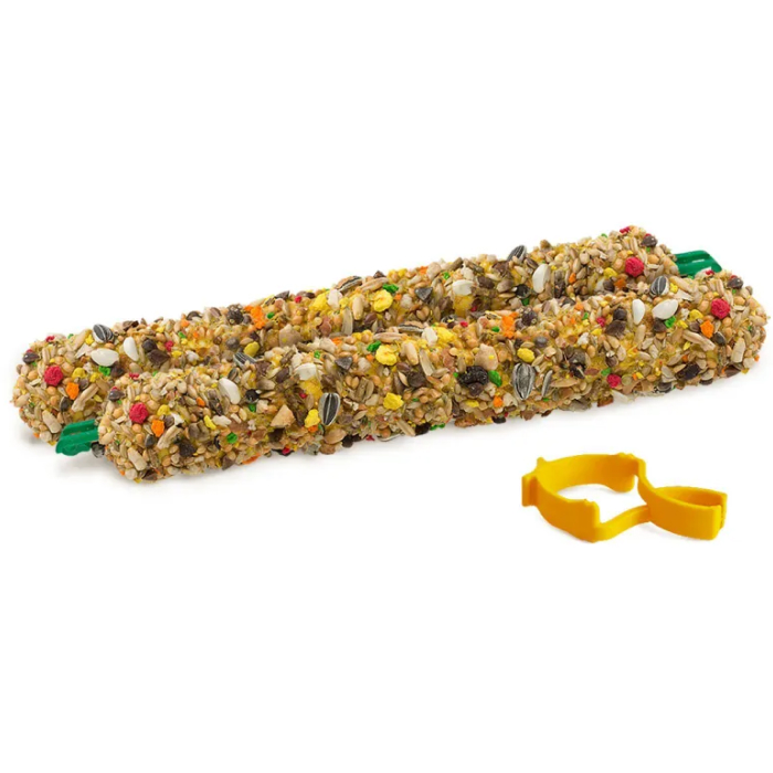 Палочки для попугаев с фруктами и ягодами содержат отборные ингредиенты и помогают разнообразить рацион питомца. Специально для удобства крупных попугаев палочка RIO крупного размера. Для хрустящей консистенции палочки выпекаются в печах по технологии бережного запекания, которая сохраняет все полезные свойства продукта. Основа лакомства – буковый стержень, который служит отличным инструментом для стачивания клюва. Палочки могут занять питомца на долгое время, а также станут удобным инструментом для игр и дрессировки. Встроенное пластиковое крепление удобно крепится к клеткам любого типа.