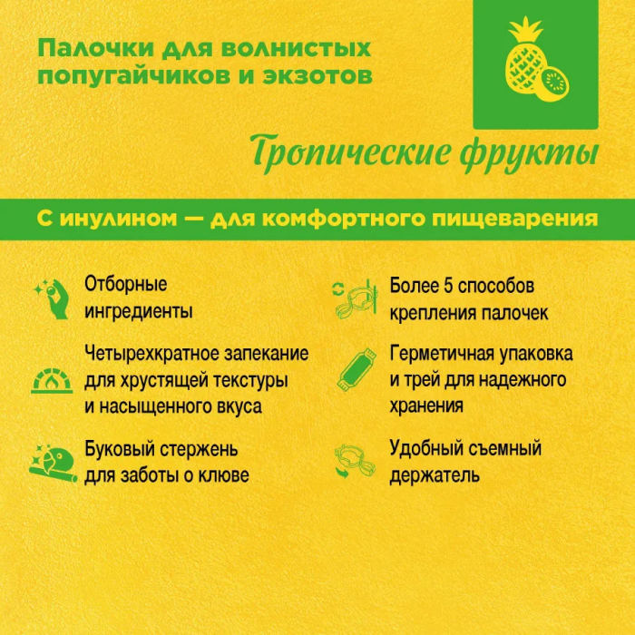 Лакомство для волнистых попугайчиков и экзотов с тропическими фруктами. Дополнительное питание для декоративных птиц.