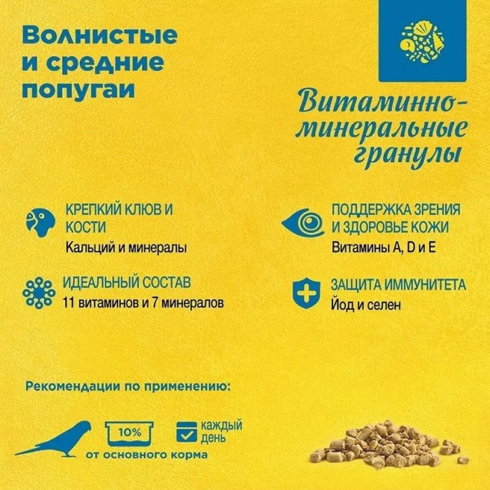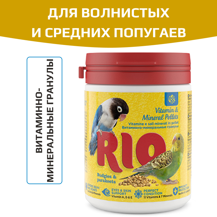 Птицы в домашних условиях часто испытывают недостаток витаминов и минеральных веществ. Например, витамин D3 вырабатывается в организме птиц только под действием ультрафиолета. Птицы, находящиеся в неволе, из-за недостатка солнечного света не могут синтезировать достаточное количество витамина D3 самостоятельно. Витаминно-минеральные гранулы RIO содержат комплекс важнейших витаминов, микро- и макроэлементов, необходимых для полноценного питания и здоровья домашних птиц. Ежедневное применение функционального корма исключает появление неблагоприятных последствий при несбалансированном питании. Он способствует укреплению иммунитета, улучшению зрения и состояния кожи и перьев.