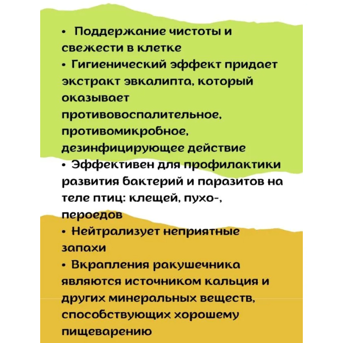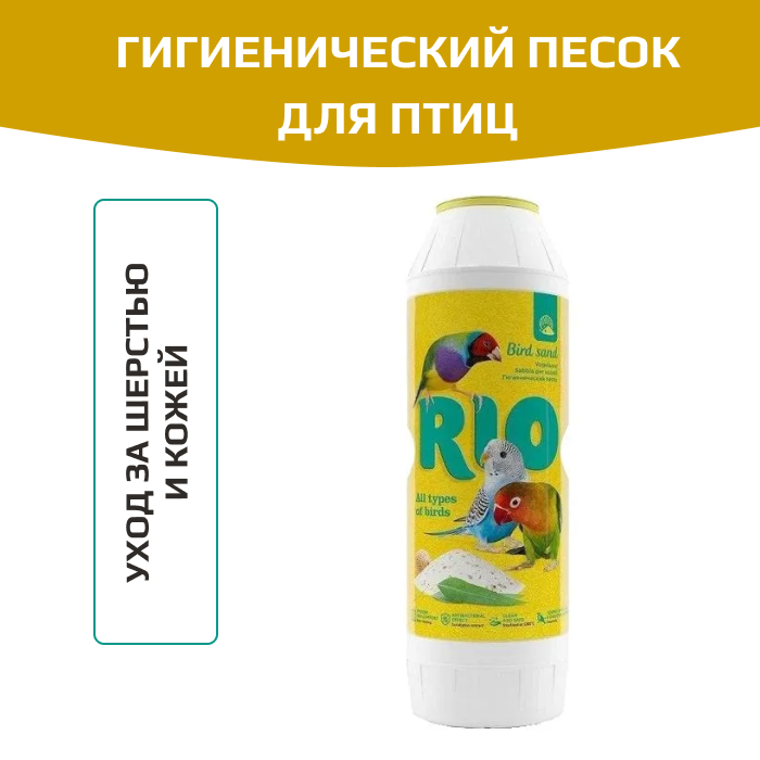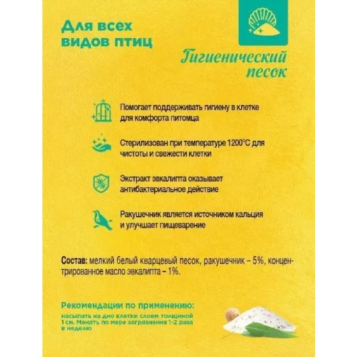 Стерилизованный при температуре свыше 1200 С песок RIO является прекрасным средством для поддержания чистоты и свежести в клетке. Дополнительный гигиенический эффект придает экстракт эвкалипта, который благодаря своим целебным свойствам оказывает противовоспалительное, противомикробное, дезинфицирующее действие. Эффективен для профилактики развития бактерий и паразитов на теле птиц: клещей, пухо- и пероедов. Нейтрализует неприятные запахи. Белый цвет песка способствует сохранению естественного окраса птицы. Вкрапления ракушечника являются источником кальция и других минеральных веществ.