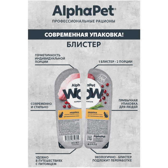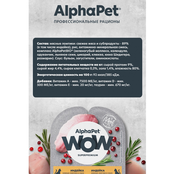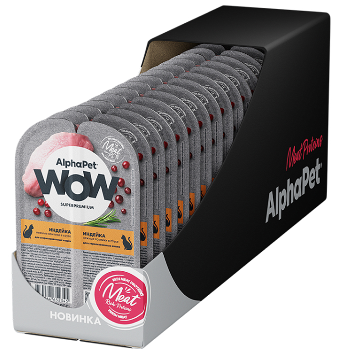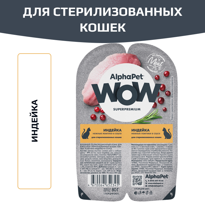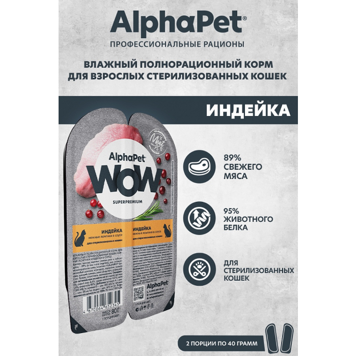 AlphaPet WOW Superpremium влажный полнорационный корм для взрослых стерилизованных кошек нежные ломтики индейки в соусе.