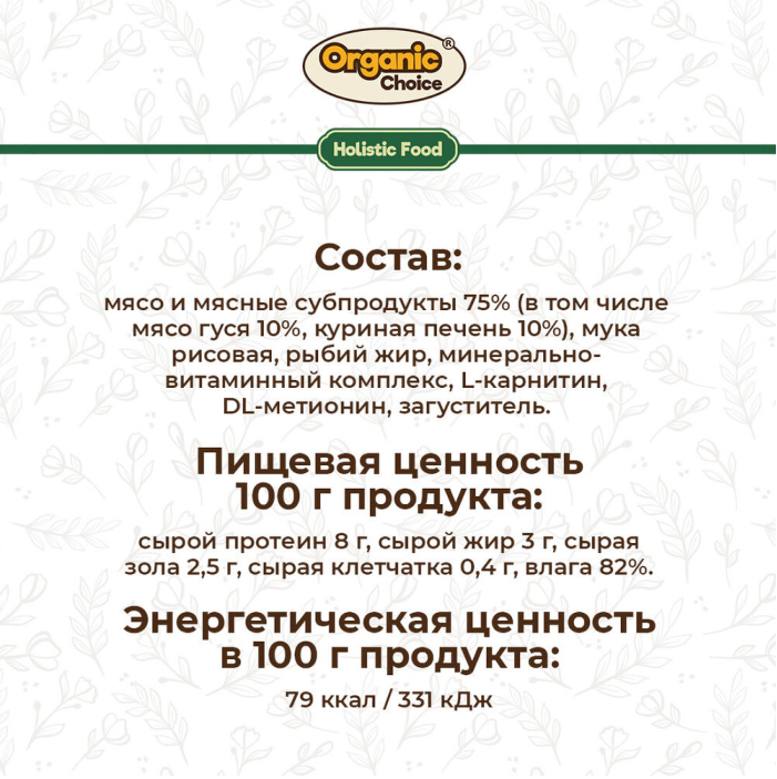 мясо и мясные субпродукты 75% (в том числе мясо гуся 10%, куриная печень 10%), мука рисовая, рыбий жир, минерально-витаминный комплекс, L-карнитин, DL-метионин, загуститель.