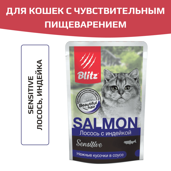 Blitz Sensitive Salmon & Turkey in Gravy Adult Cats All Breeds корм консервированный для взрослых кошек с чувствительным пищеварением лосось с индейкой нежные кусочки в соусе.