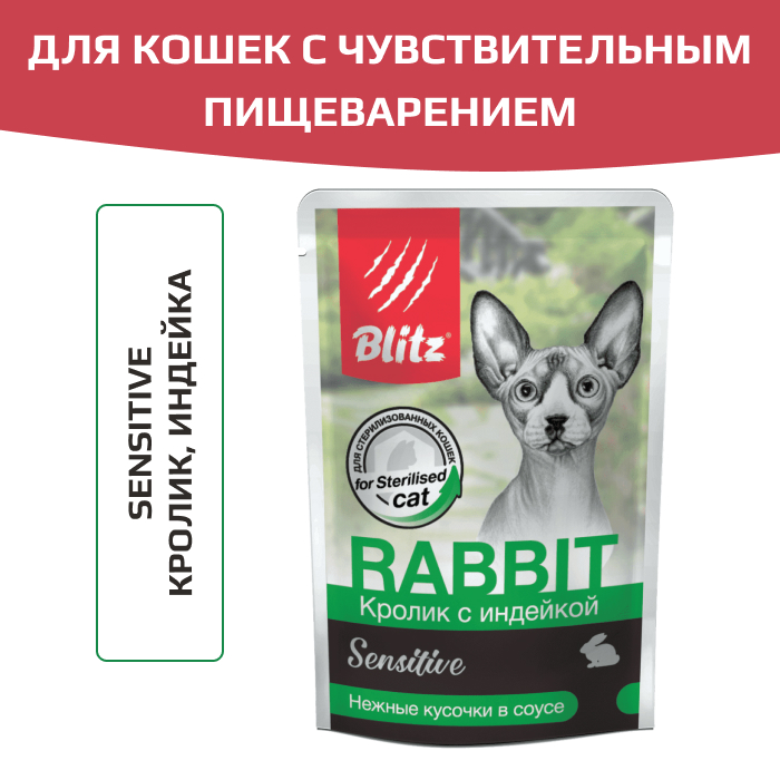 Blitz Sensitive Cat Rabbit & Turkey in Gravy корм консервированный для кошек с чувствительным пищеварением кролик с индейкой нежные кусочки в соусе.