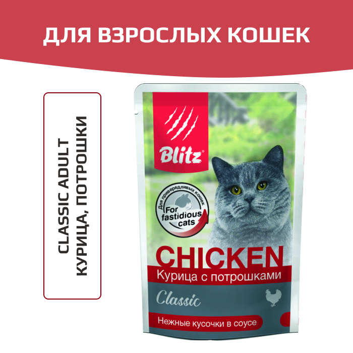 Blitz Classic Chicken & Inners in Gravy Adult Cat All Breeds корм консервированный для взрослых кошек курица с потрошками нежные кусочки в соусе.