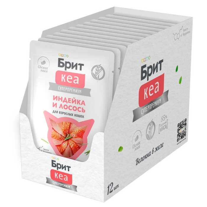 Вся линейка паучей и ламиcтеров Брит Кеа "Волокна в желе" построена на индейке как основном белке, с добавками разных морепродуктов. Это уникальная фишка линейки — моно-белковый состав на базе индейки + сочные волокна и желе, обогащенные спирулиной и таурином, создающие функциональное лакомство для взрослых кошек и котят. Сочетание диетической индейки с жирными кислотами из лосося помогает сохранить здоровье кожи и яркость шерсти. Особенности: поддержка сердечно-сосудистой системы; DHA и EPA из лосося; спирулина — природный источник витаминов группы B и хлорофилла; вкусно и полезно — без сои и злаков.
