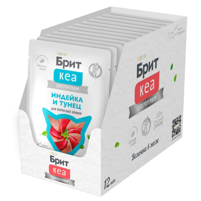 Вся линейка паучей и ламиcтеров Брит Кеа "Волокна в желе" построена на индейке как основном белке, с добавками разных морепродуктов. Это уникальная фишка линейки — моно-белковый состав на базе индейки + сочные волокна и желе, обогащенные спирулиной и таурином, создающие функциональное лакомство для взрослых кошек и котят. Вкусное и питательное дополнение к рациону на основе индейки и тунца. Идеально для поддержания активности. Особенности: тунец — источник Омега-3 и таурина; легкое усвоение и высокая поедаемость; поддержка ЖКТ и метаболизма; добавлена спирулина — антиоксидант и стимулятор иммунитета.