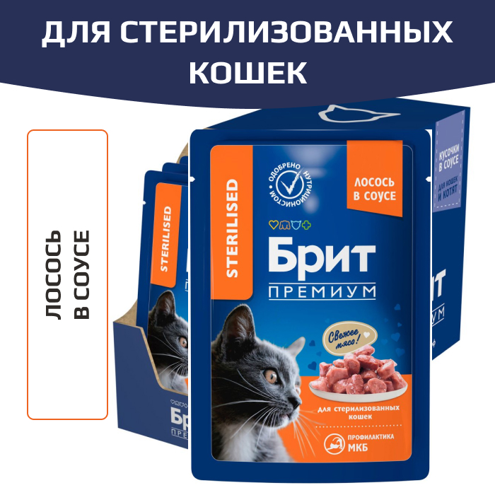 Brit Premium Sterilised корм консервированный для стерилизованных кошек, лосось в соусе.