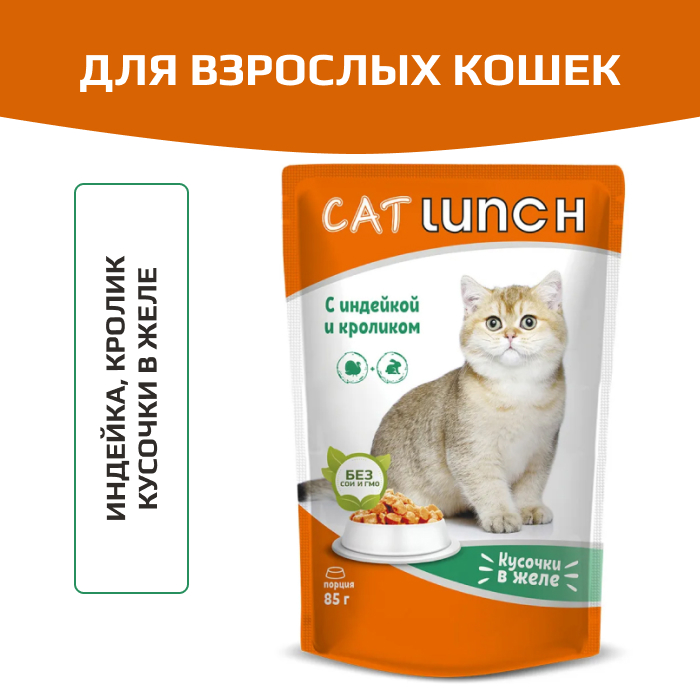 Cat Lunch корм консервированный для кошек кусочки в желе Индейка и Кролик.