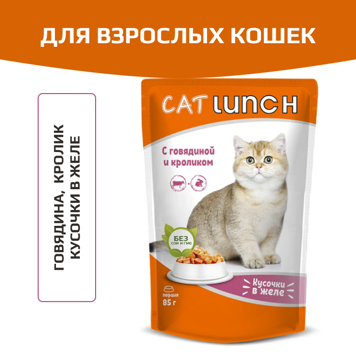Cat Lunch корм консервированный для кошек кусочки в желе с Говядиной и Кроликом.