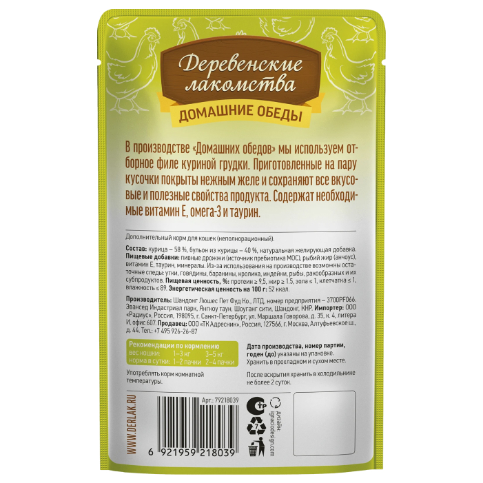 Консервированный влажный корм для кошек серии «Деревенские лакомства — Домашние обеды» — полноценный обед для вашей кошки, представляющий собой нежные кусочки курицы, приготовленные на пару и залитые аппетитным натуральным желе. Этот корм не только доставит удовольствие вашему питомцу, но и обеспечит его энергией для активной жизни. Легкая текстура желе облегчает процесс потребления, делая этот продукт идеальным даже для самых привередливых питомцев. Побалуйте своего любимца изысканным и полезным лакомством! Дополнительный корм для кошек (неполнорационный).