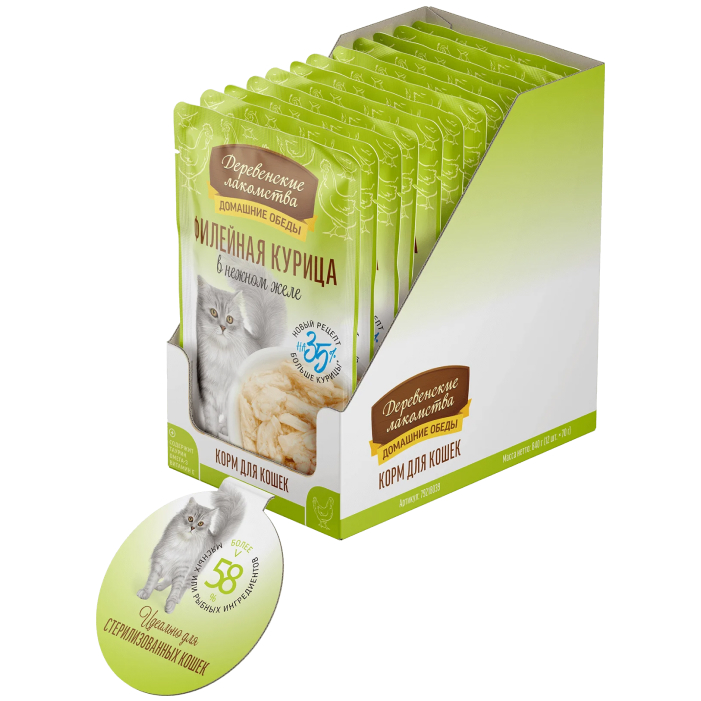Деревенские лакомства корм консервированный для кошек филейная курица в нежном желе.