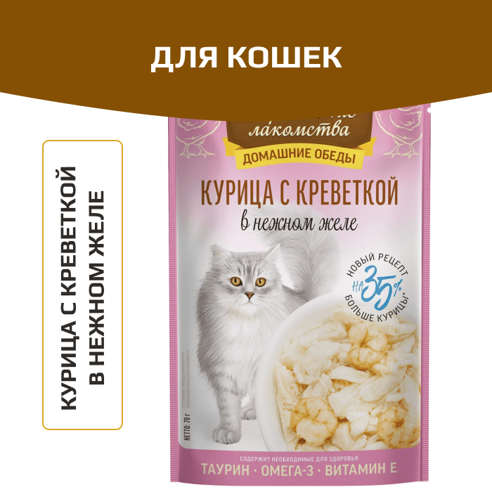 Консервированный влажный корм для кошек серии «Деревенские лакомства — Домашние обеды» — это полноценный обед из сочных, приготовленных на пару, кусочков курицы и цельных креветок. Откройте для своего кота мир гастрономических удовольствий с каждым кусочком. Насыщенный природный вкус без усилителей вкуса и консервантов, для тех, кто ценит здоровое питание. Легкая текстура желе облегчает процесс потребления, делая этот продукт идеальным даже для самых привередливых питомцев. Побалуйте своего любимца изысканным и полезным лакомством! Дополнительный корм для кошек (неполнорационный).