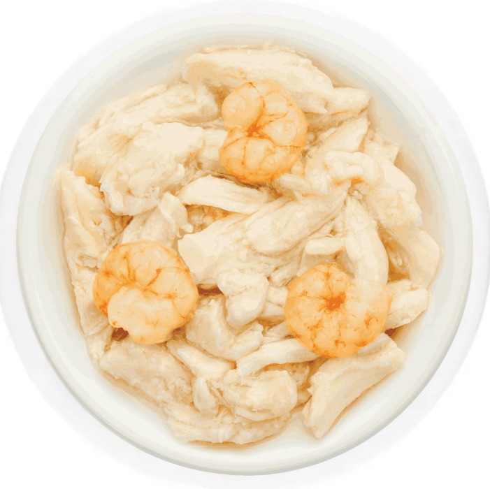 курица 54 %, бульон из курицы 40 %, креветка 4 %, натуральная желирующая добавка.