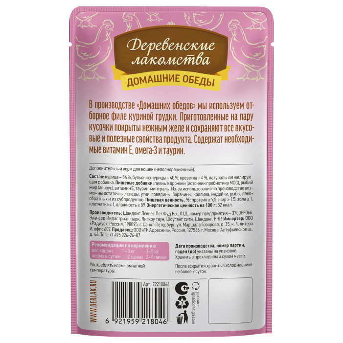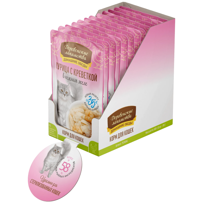 Деревенские лакомства корм консервированный для кошек курица с креветкой в нежном желе.