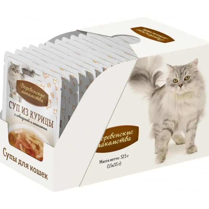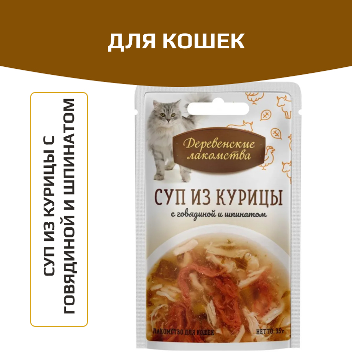 Деревенские лакомства пауч для кошек суп из курицы с говядиной и шпинатом.