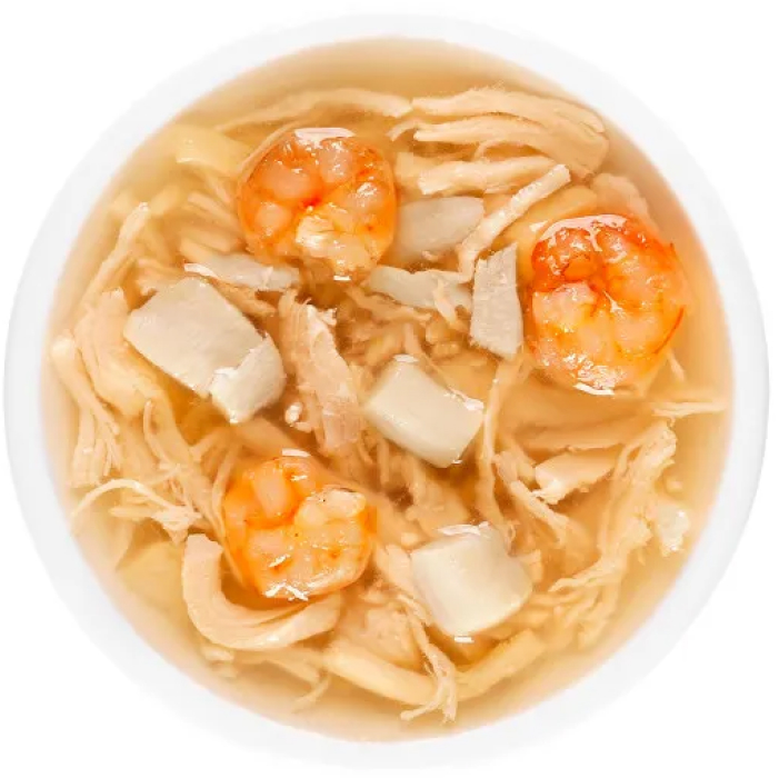 Нежнейшее филе курицы, креветка и гребешок получили идеальное сочетание с густым бульоном в супе для кошек. Лакомство можно давать как отдельное блюдо или использовать как подливку для сухих кормов.