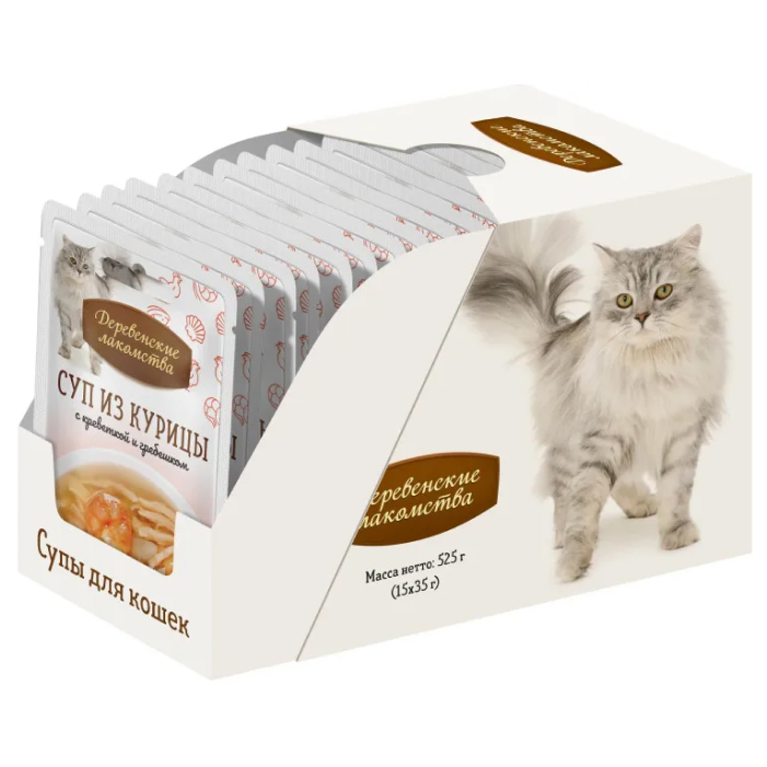 Деревенские лакомства пауч для кошек суп из курицы с креветкой и гребешком.