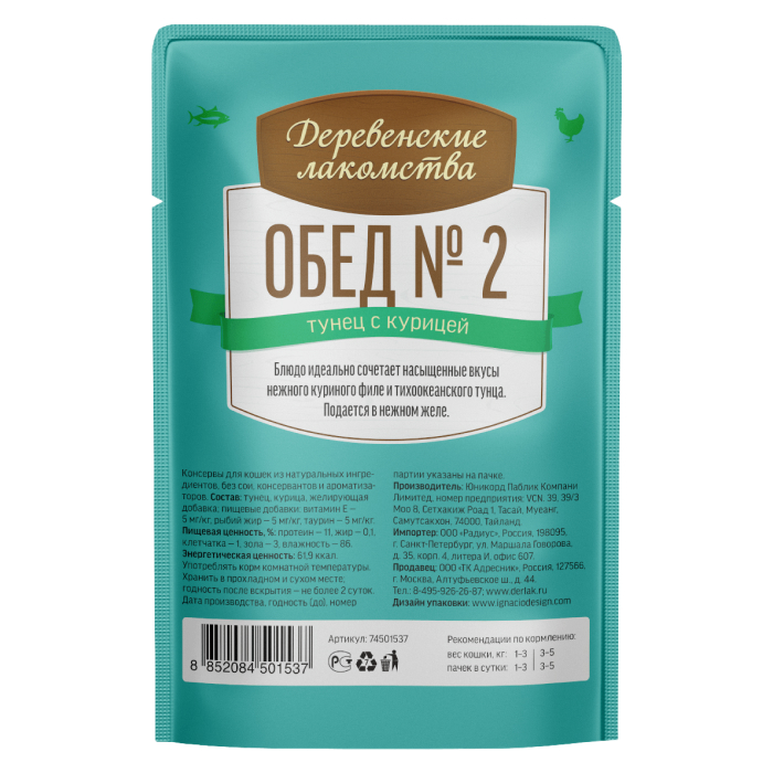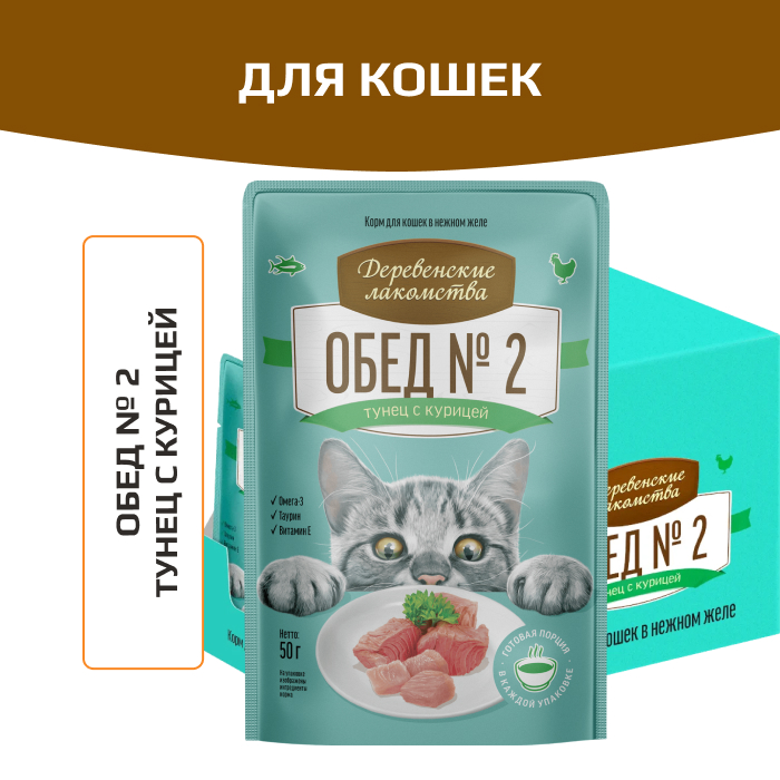 Деревенские лакомства пауч Обед №2 для кошек тунец с курицей.