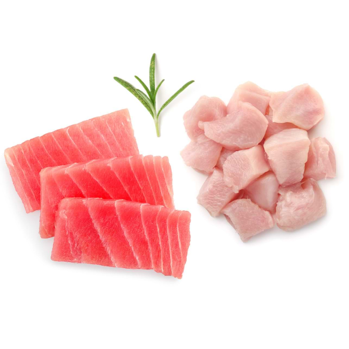 Филе тунца (50%), Куриная грудка (10%).