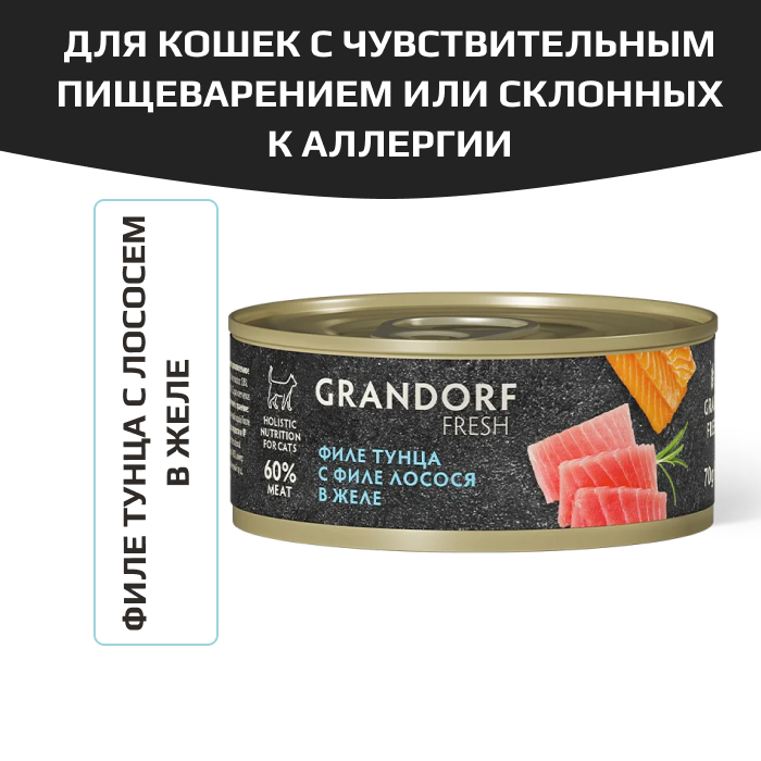 Grandorf FRESH Tuna with salmon in jelly для кошек всех возрастов с нормальной активностью, чувствительным пищеварением или склонных к аллергии, филе тунца с филе лосося в желе.