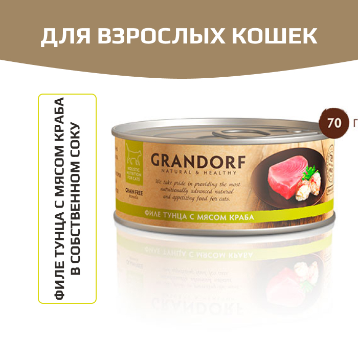 Консервы Grandorf Tuna with Crab in Broth филе тунца с мясом краба - влажный корм для кошек класса холистик (филе тунца с мясом краба в собственном соку).