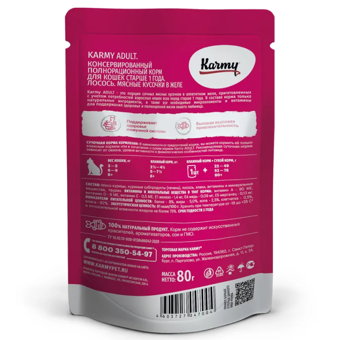 Консервированный полнорационный корм для кошек старше 1 года. Karmy Adult - это порция аппетитных кусочков в ароматном желе, приготовленных с учетом индивидуальных потребностей взрослых кошек всех пород старше 1 года. В составе корма только натуральные ингредиенты, а также все необходимые микроэлементы и витамины для поддержания здоровья и полноценной жизни вашего любимца.