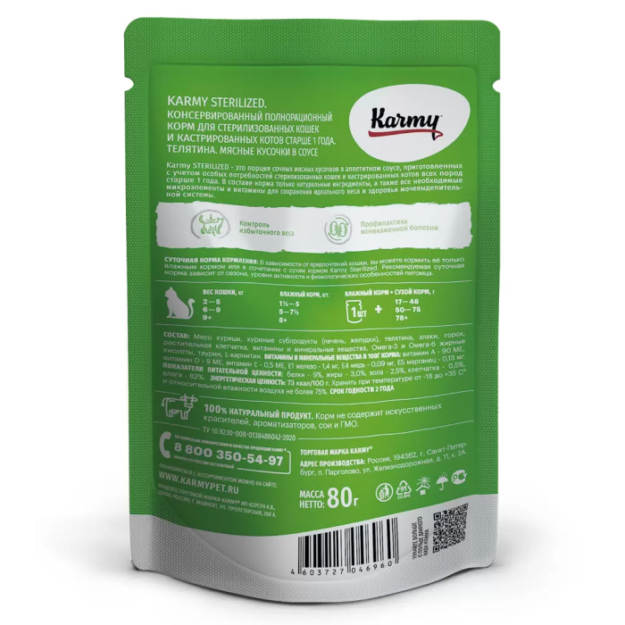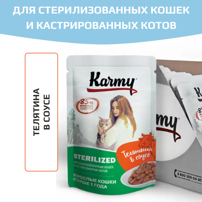 KARMY STERILIZED корм для стерилизованных кошек и кастрированных котов консервы Телятина в соусе.