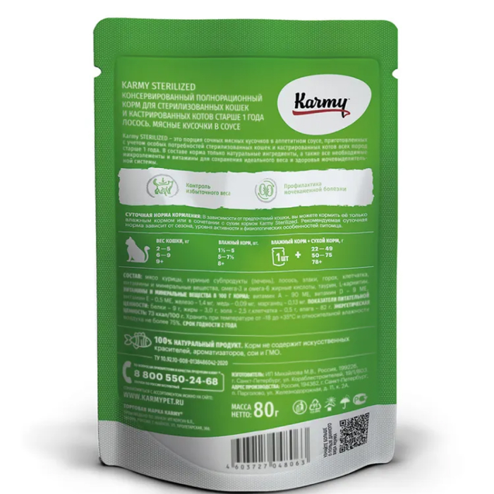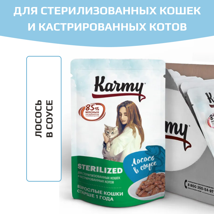 KARMY STERILIZED корм для стерилизованных кошек и кастрированных котов консервы Лосось в соусе.