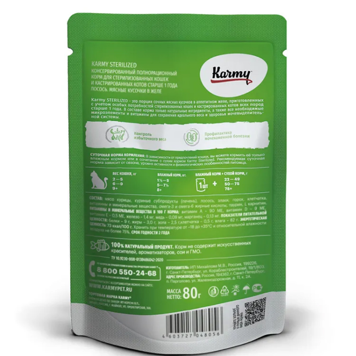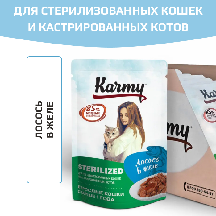 KARMY STERILIZED корм для стерилизованных кошек и кастрированных котов консервы Лосось в желе.