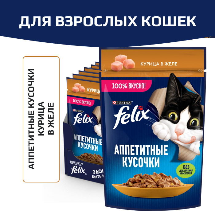 Эксперты Purina, разрабатывая влажные корма для домашних любимцев, создали корм для взрослых кошек Felix «Аппетитные кусочки» — специально для Вашего любителя вкуснятины. Влажный корм для кошек Felix Аппетитные кусочки — полнорационный, содержит все необходимое для здоровой активной долгой жизни.