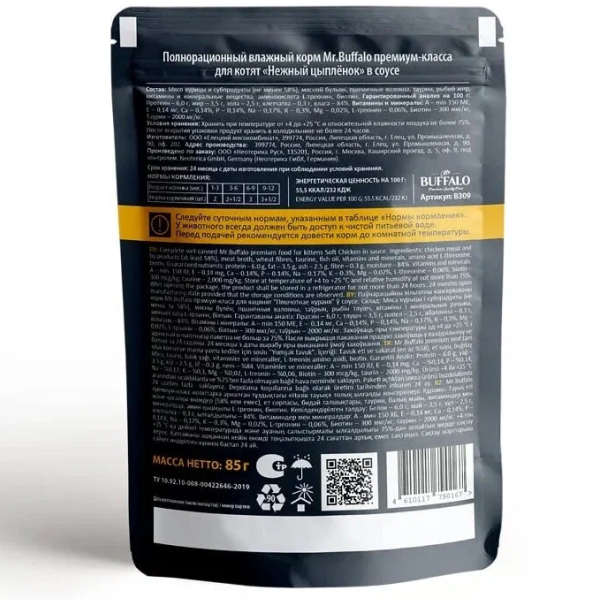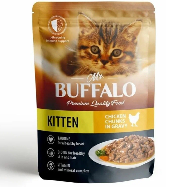 Полнорационный влажный корм Mr. Buffalo с цыпленком для котят, изготовлен из натуральных, гипоаллергенных, легко усваиваемых ингредиентов, которые снижают риск индивидуальной непереносимости пищевых продуктов. Рецептура корма обеспечивает сбалансированное питание благодаря содержанию всех необходимых питательных веществ для здорового развития растущих котят.