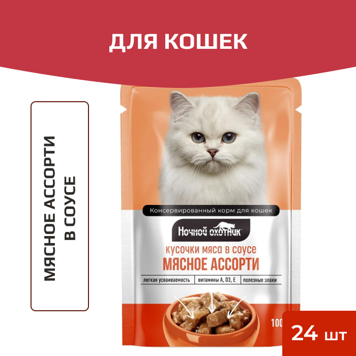 Ночной охотник корм консервированный для кошек мясное ассорти в соусе.