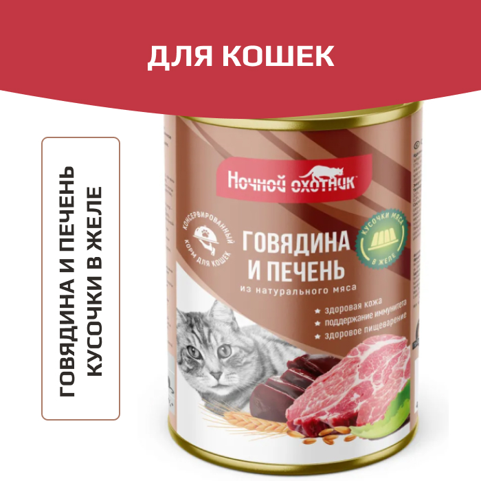 Ночной охотник корм консервированный для кошек говядина/печень кусочки в желе.