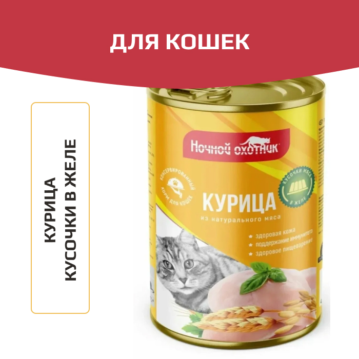 Ночной охотник корм консервированный для кошек курица кусочки в желе.