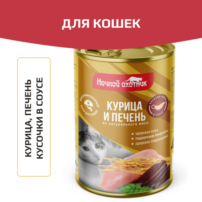 Ночной охотник корм консервированный для кошек курица/печень в соусе.