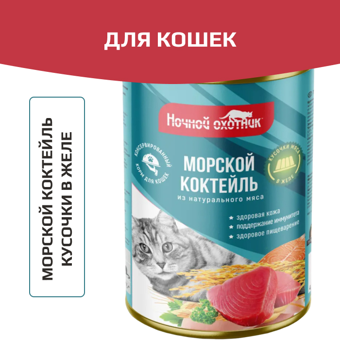 Ночной охотник корм консервированный для кошек морской коктейль кусочки в желе.