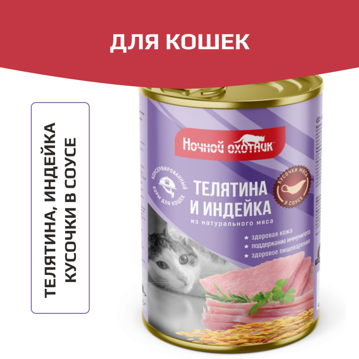 Ночной охотник корм консервированный для кошек телятина/индейка в соусе.