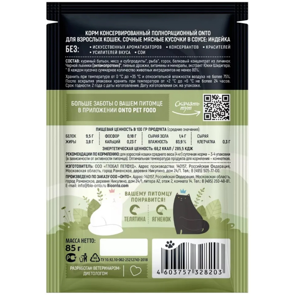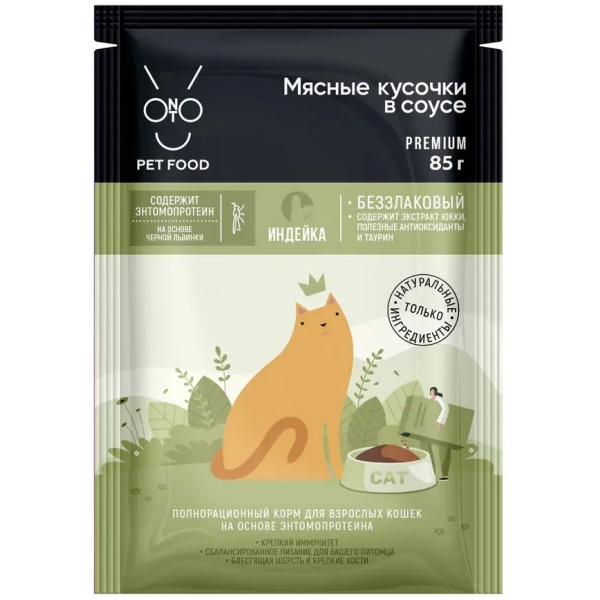 ONTO пауч для кошек Мясные кусочки в соусе с энтомопротеином, индейка.