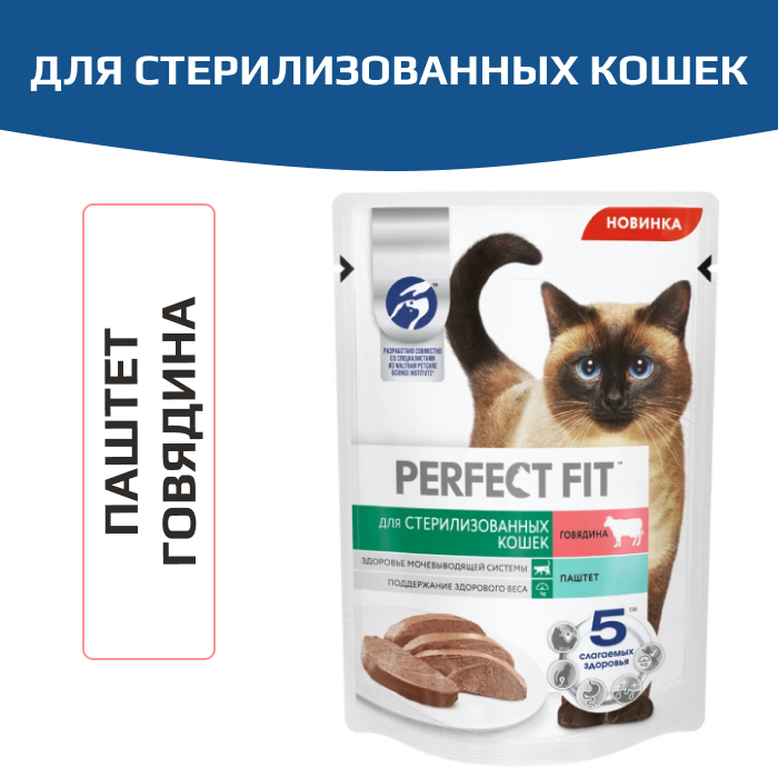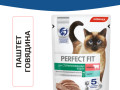 Влажный корм в паучах PERFECT FIT™ паштет с говядиной для стерилизованных кошек разработан по специальной рецептуре для контроля здоровья кошек, прошедших стерилизацию.
