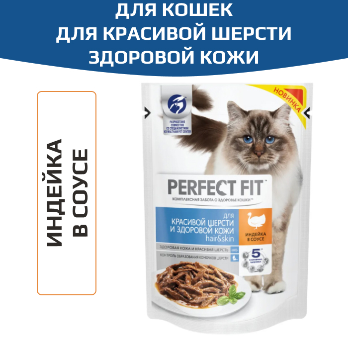PERFECT FIT корм консервированный для взрослых кошек для красивой шерсти и здоровой кожи индейка.