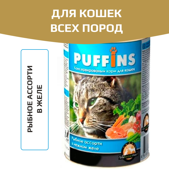 Puffins корм консервированный для кошек рыбное ассорти в желе.
