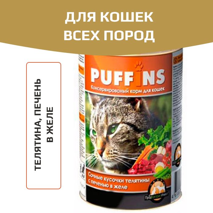 Puffins корм консервированный для кошек телятина с печенью в желе.